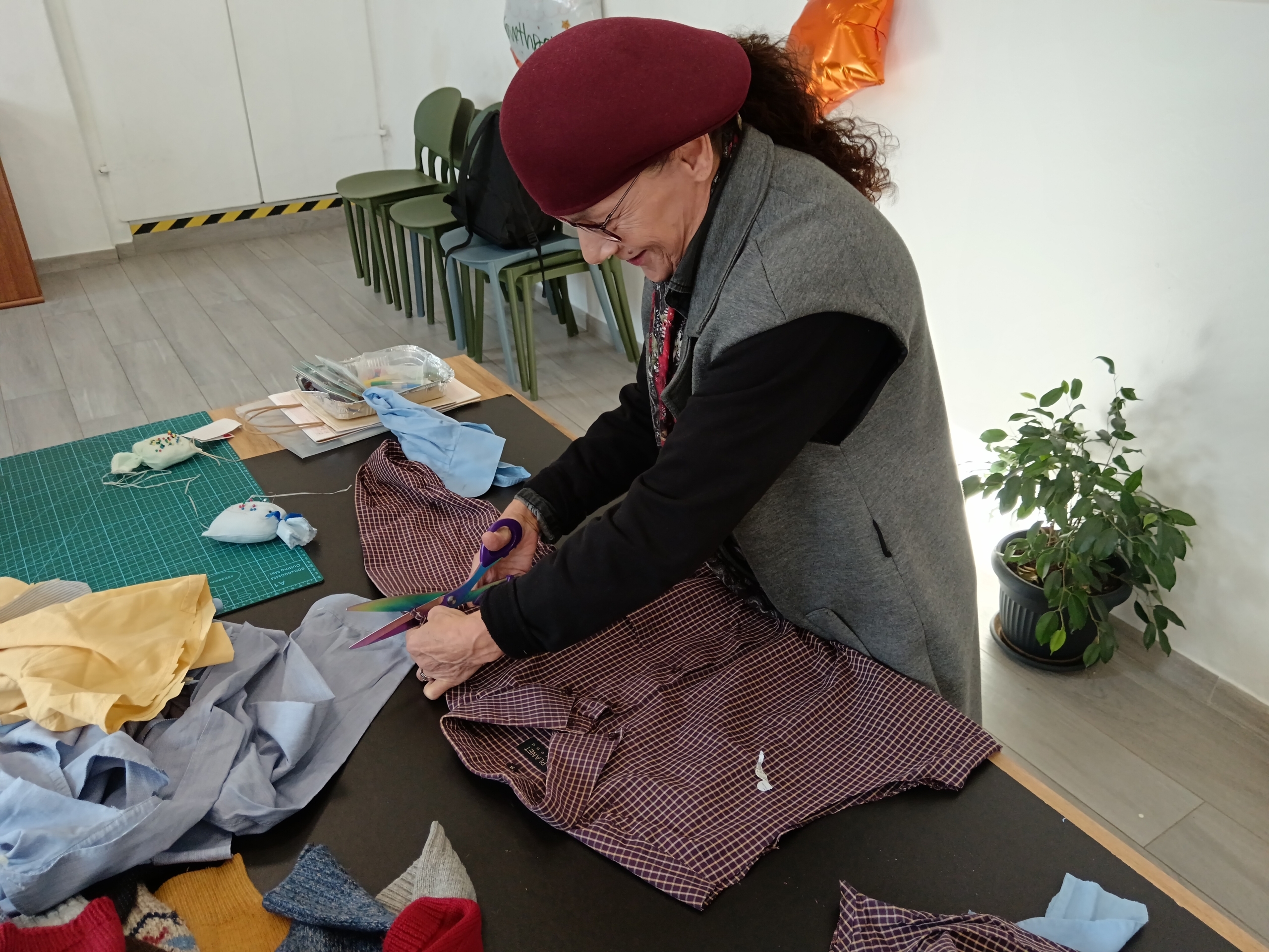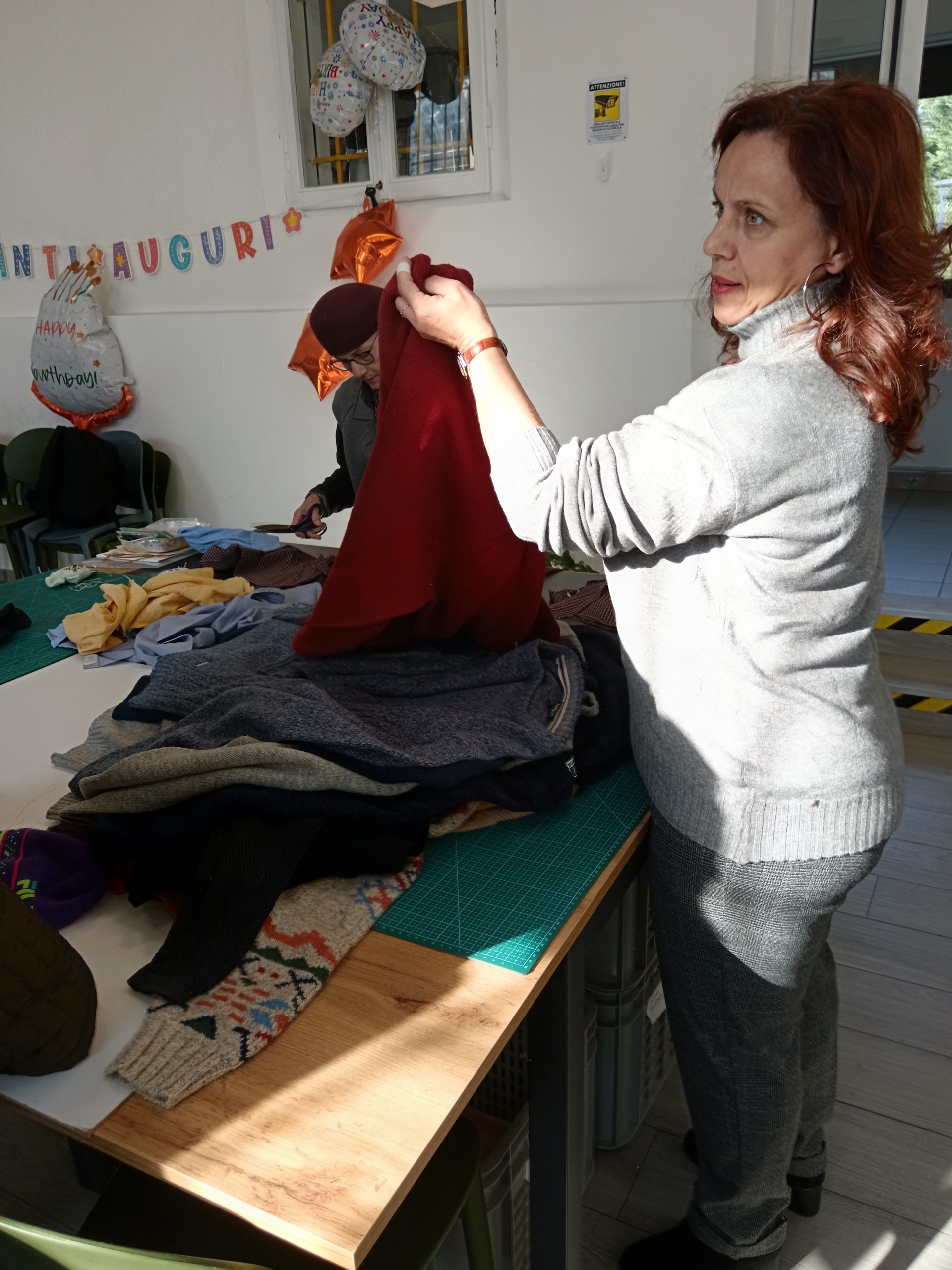 Mentre raccogliamo questa intervista Caterina non si è mai fermata e ha tagliato e cucito due berretti, provenienti da un unico maglione e Maria e Beatrice hanno tagliato diverse camicie che a breve diventeranno boxer per i kit di sopravvivenza.