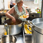 «Ho 72 anni e prima di andare in pensione facevo il medico – racconta Raffaella, mentre non smette un secondo di riempire piatti – conoscevo amici che venivano già qui e allora, due anni fa, li ho seguiti. Faccio servizio il venerdì in cucina dalle 9 alle 14. Oggi, in base a cosa abbiamo trovato in dispensa, abbiamo preparato pasta al sugo, che va bene anche per chi non mangia maiale, cappellacci, spezzatino di salume, polpettine e hamburger di verdura sempre per chi non mangia maiale o carne in generale, patate arrosto, zucchine peperoni e melanzane e anche pomodori in insalata».