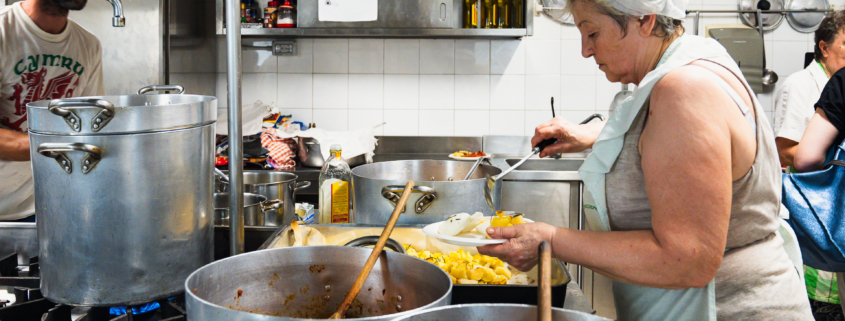 «Ho 72 anni e prima di andare in pensione facevo il medico – racconta Raffaella, mentre non smette un secondo di riempire piatti – conoscevo amici che venivano già qui e allora, due anni fa, li ho seguiti. Faccio servizio il venerdì in cucina dalle 9 alle 14. Oggi, in base a cosa abbiamo trovato in dispensa, abbiamo preparato pasta al sugo, che va bene anche per chi non mangia maiale, cappellacci, spezzatino di salume, polpettine e hamburger di verdura sempre per chi non mangia maiale o carne in generale, patate arrosto, zucchine peperoni e melanzane e anche pomodori in insalata».